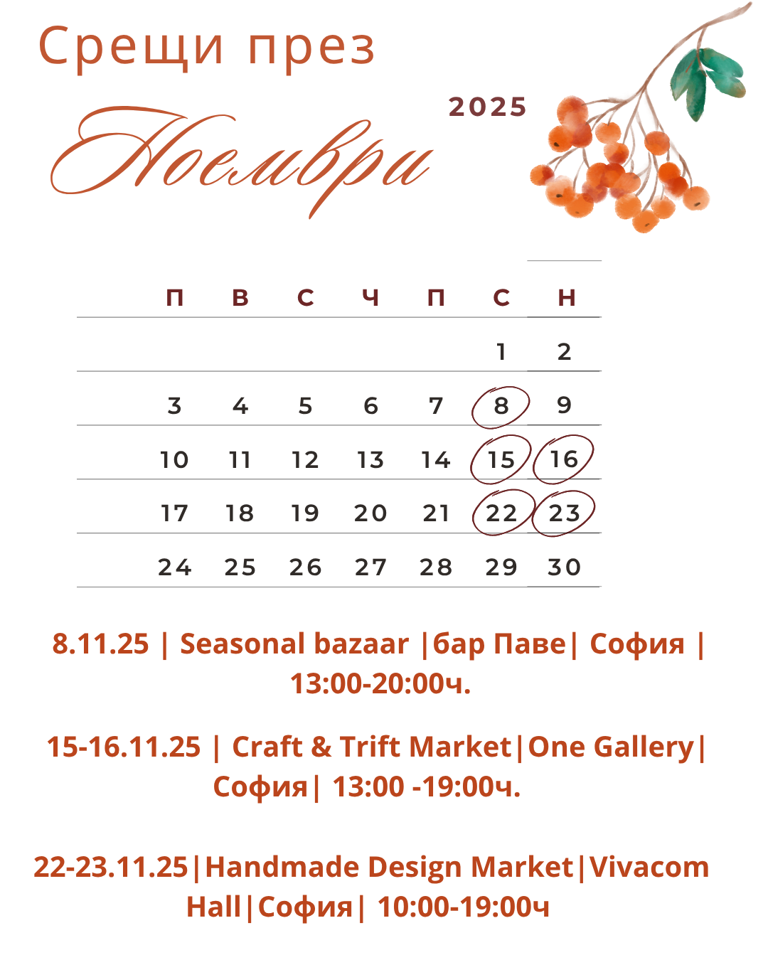 Освен онлайн в сайта ни, може да ни откриете и на различни базари и събития. Следете страницата ни в Instagram,за да научавате първи кога и къде ще участваме.