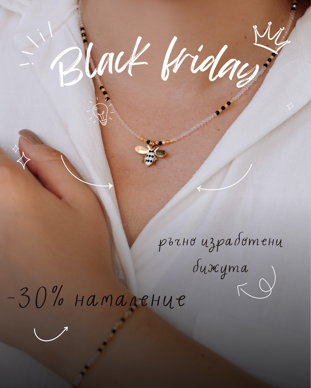 Бижутата са създадени от кристали, естествени камъни,медицинска стомана и естествени перли,изработени от бижутера Дима Йосифова–член на Камарата на занаятчиите в Пловдив. В колекцията ще откриете както авторски ръчно изработени модели,така и внимателно подбрани бижута от висококачествена стомана 316L.