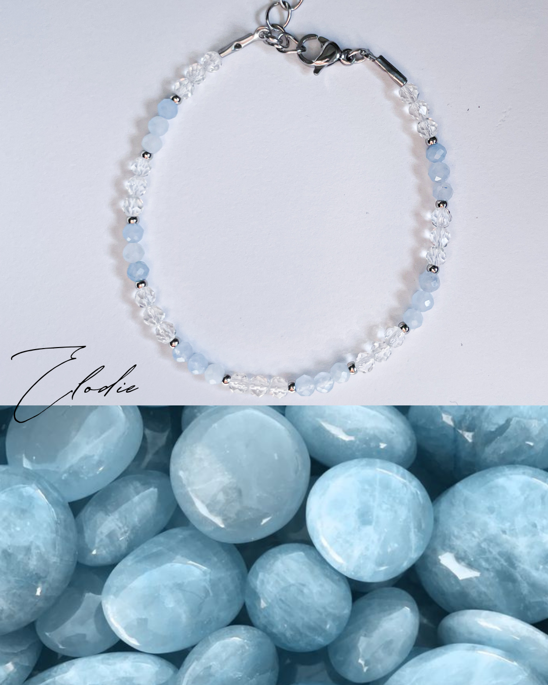 Изработва се ръчно в персонализиран размер с допълнителен удължител.Бижутата се изработват ръчно от квалифицирани бижутери в ателието на Elodie. Аквамарин — камъкът, който носи морето със себе си