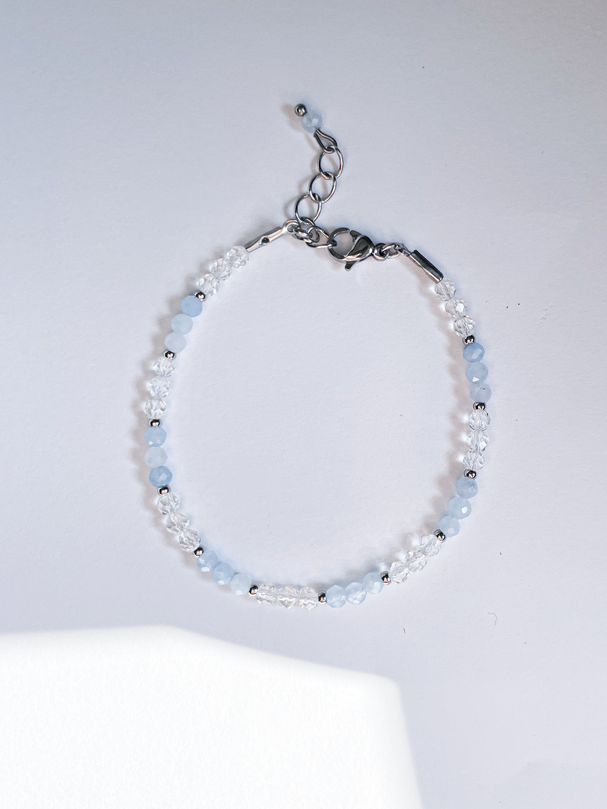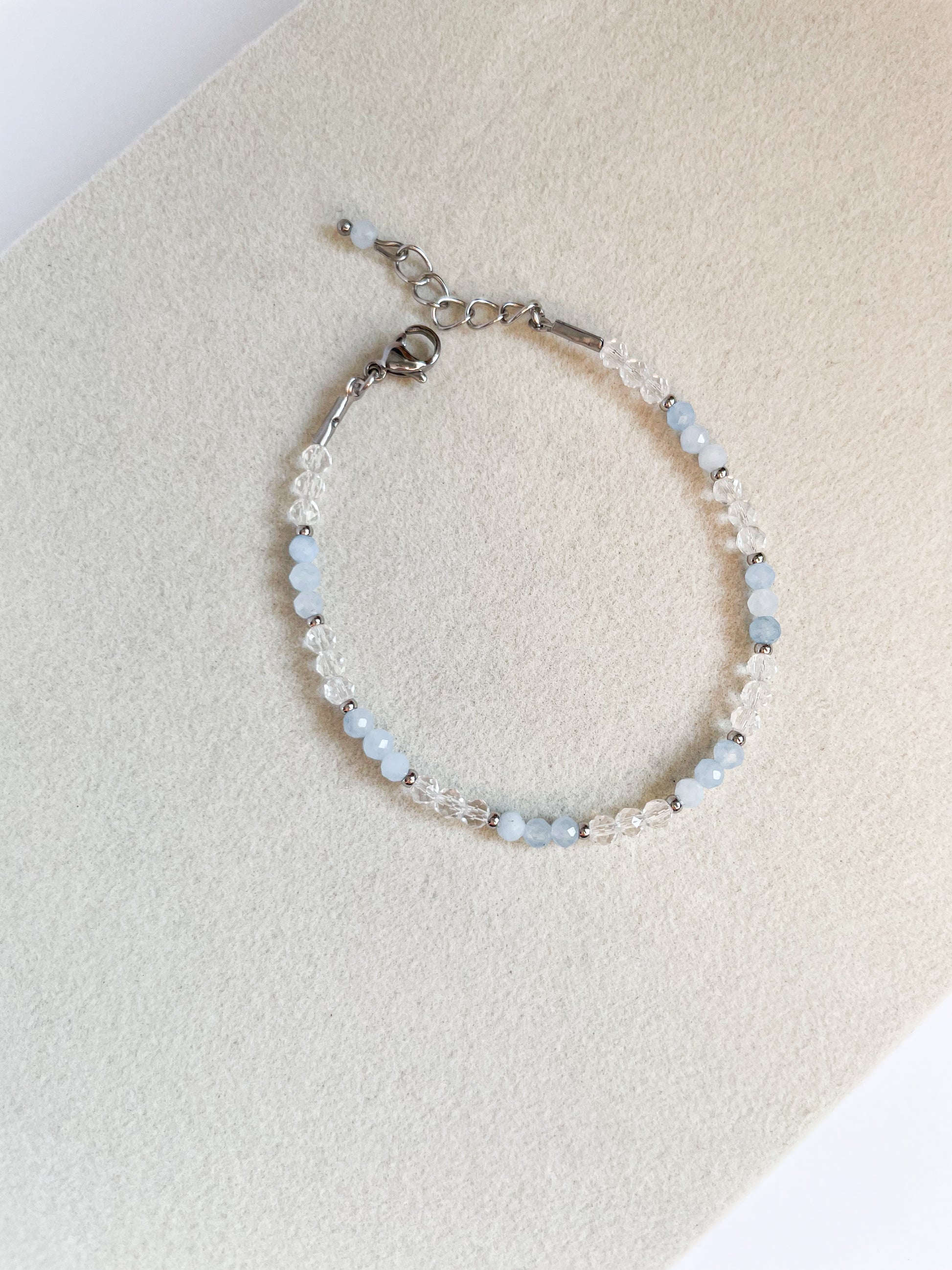 Ръчно изработена гривна с естествен фасетиран аквамарин 3мм,прозрачни италиански кристали и елементи от медицинска стомана.