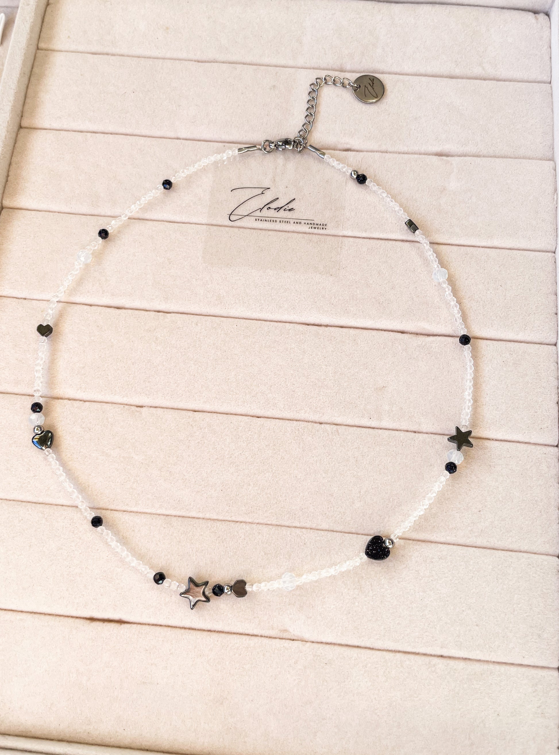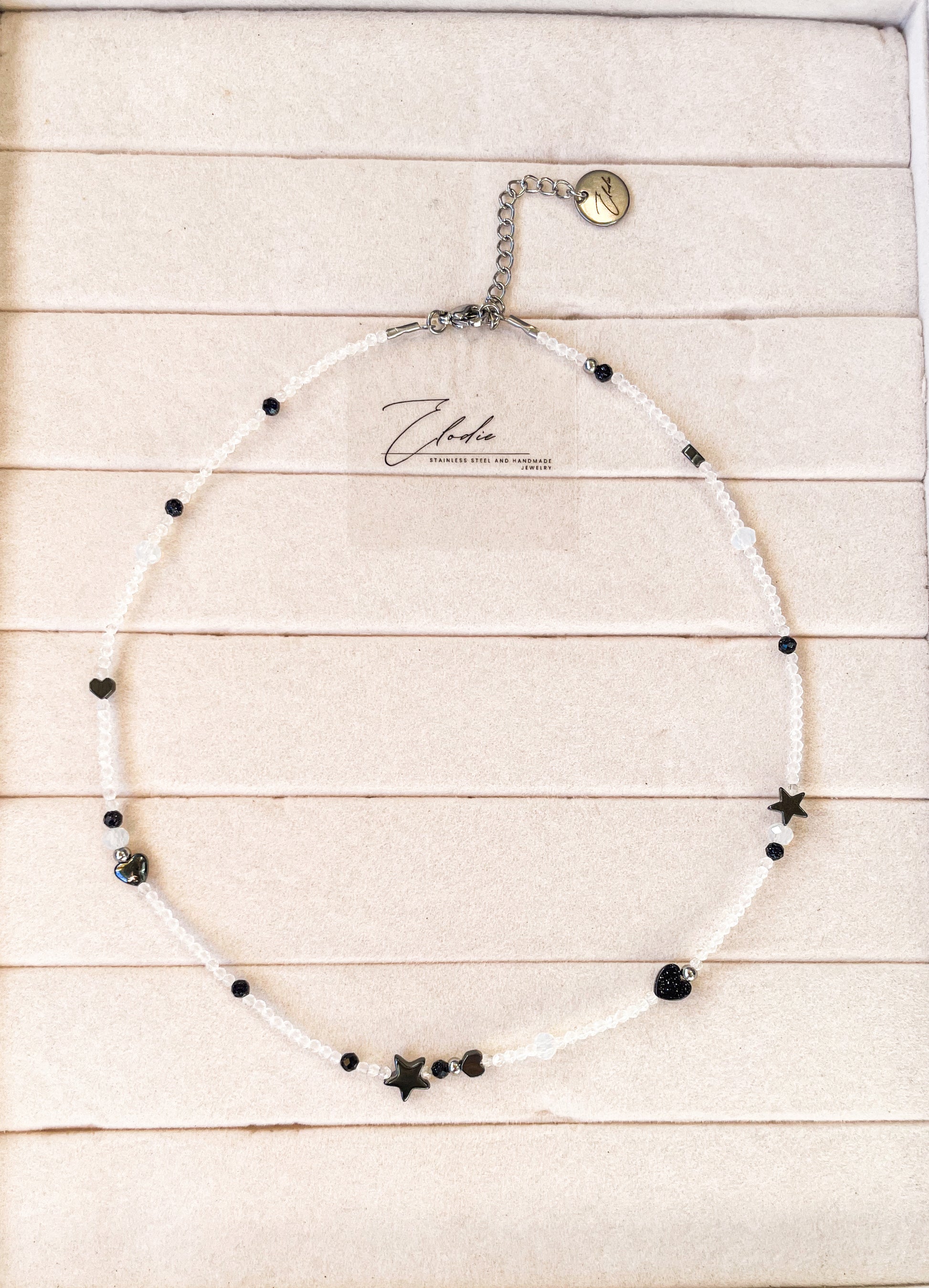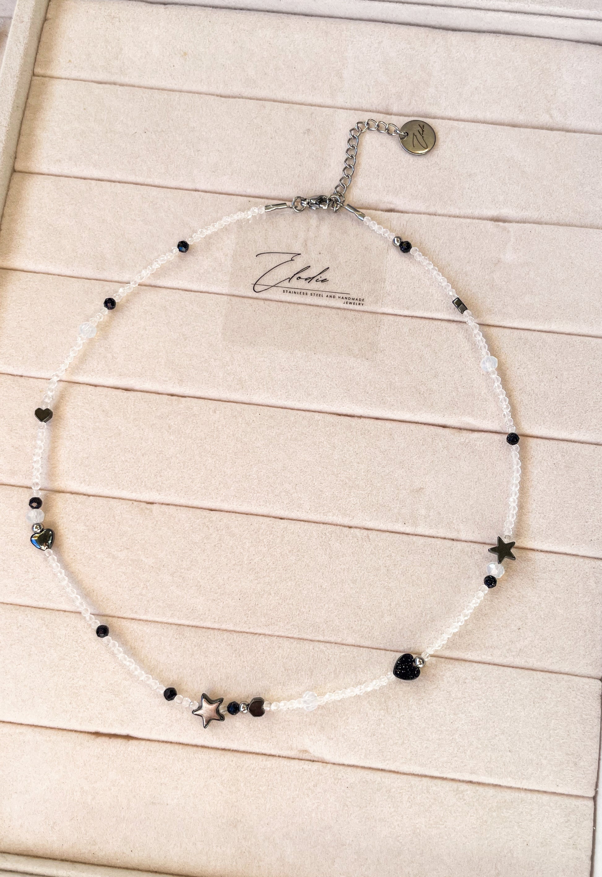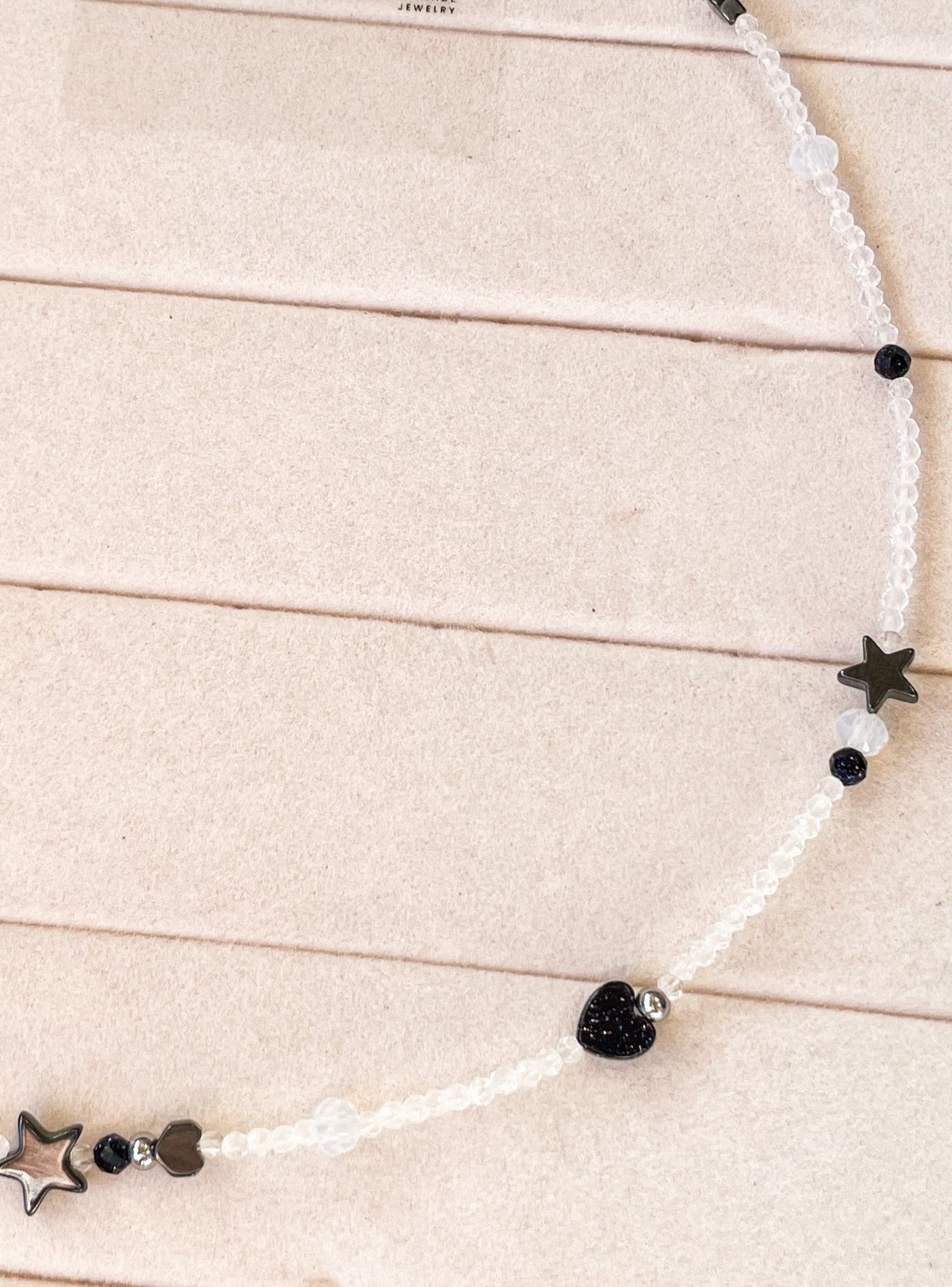 Открий магията на небесната енергия с това изящно колие с прозрачни кристали, украсено със звезди от хематит и сърце от син авантюрин – камъкът на спокойствието и увереността.