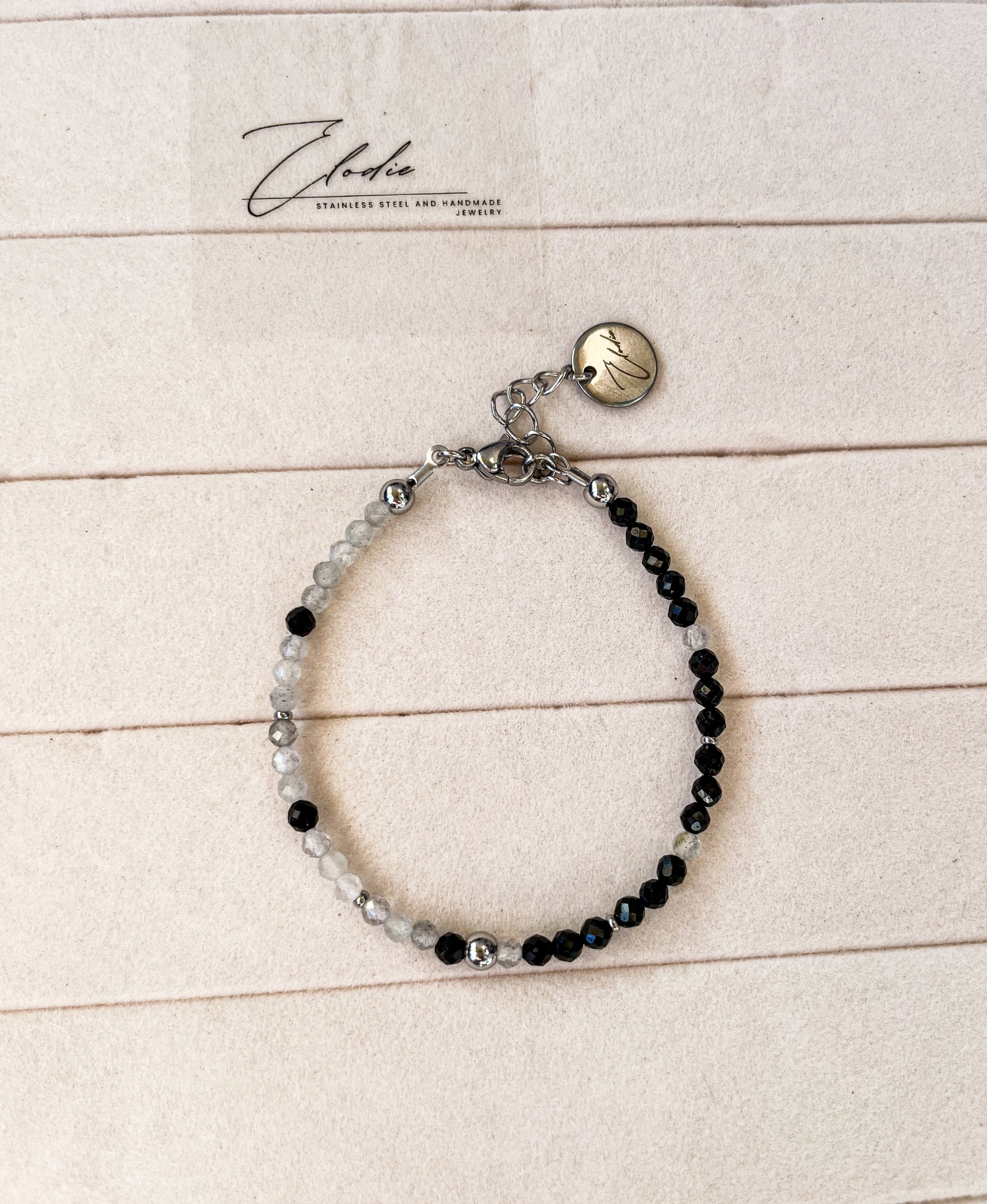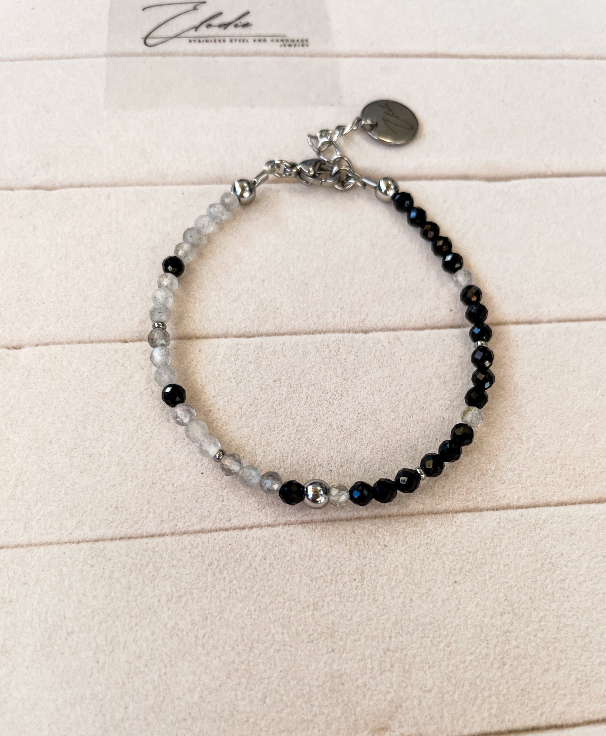 Комбинацията от двата камъка съчетава мощната енергия на черния турмалин – пазител срещу негативност и стрес – с мистичната светлина на лабрадорита, известен като камък на трансформацията и интуицията.