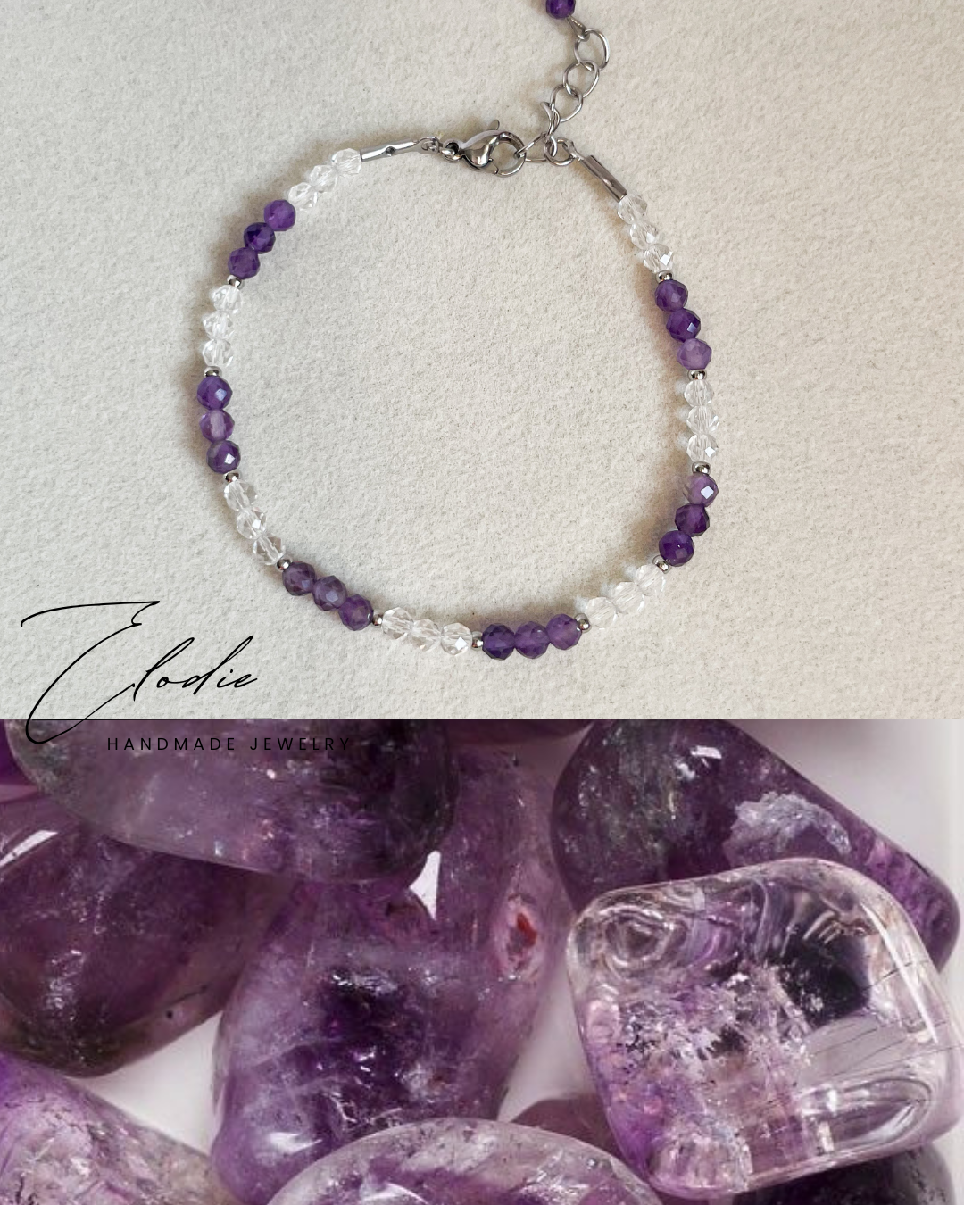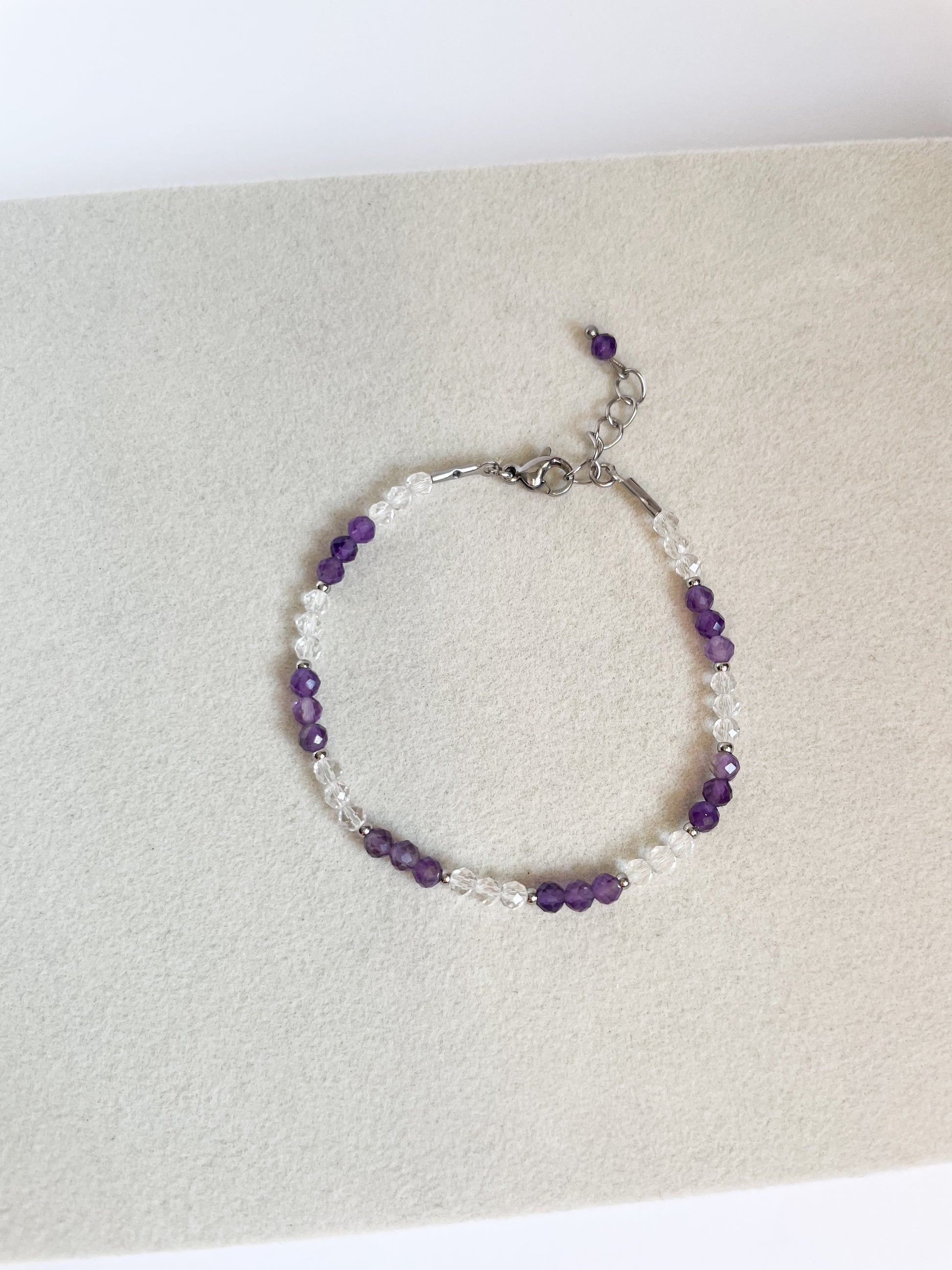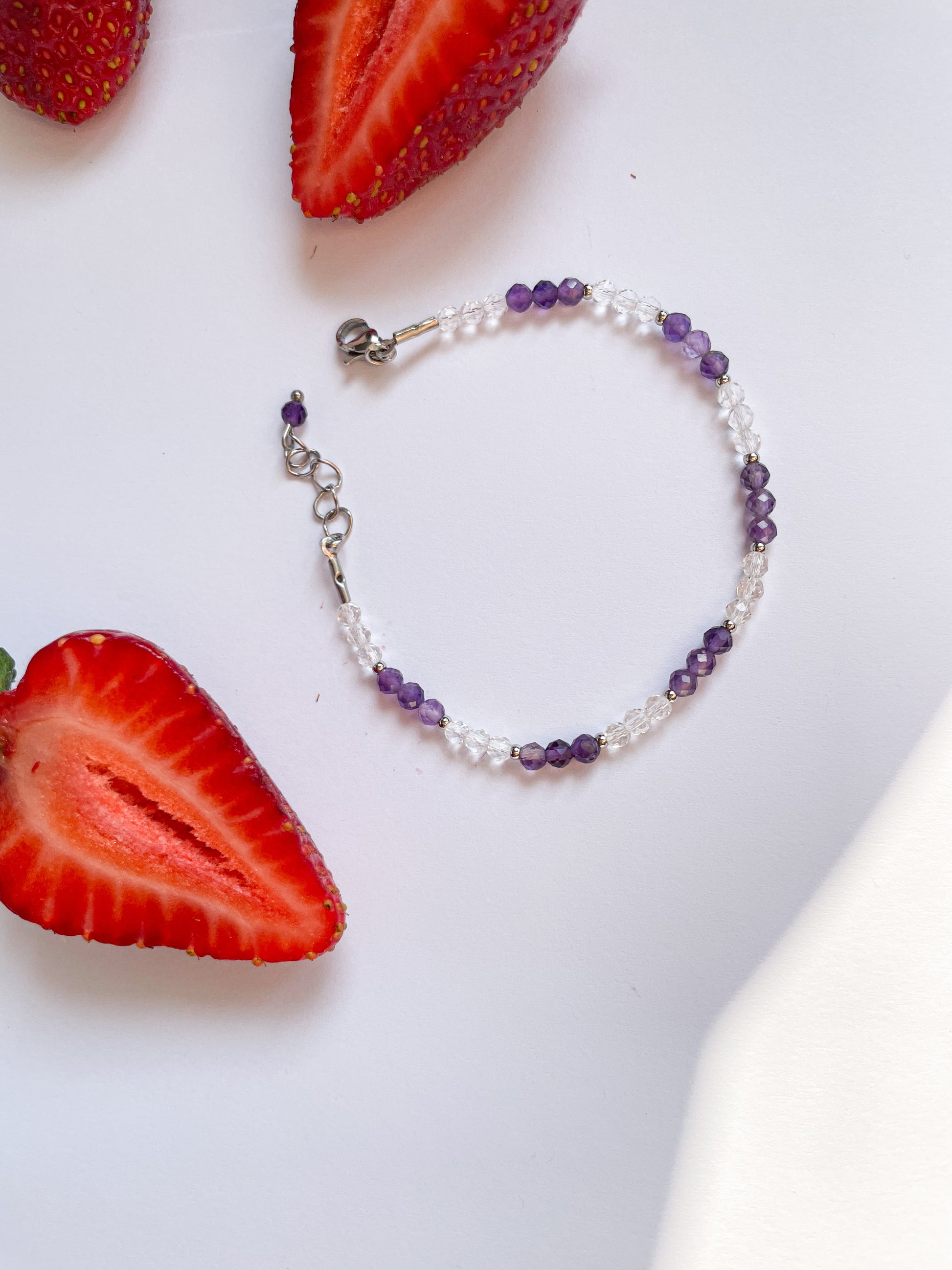 Ръчно изработена гривна с естествен фасетиран аметист 3мм,прозрачни италиански кристали и елементи от медицинска стомана.