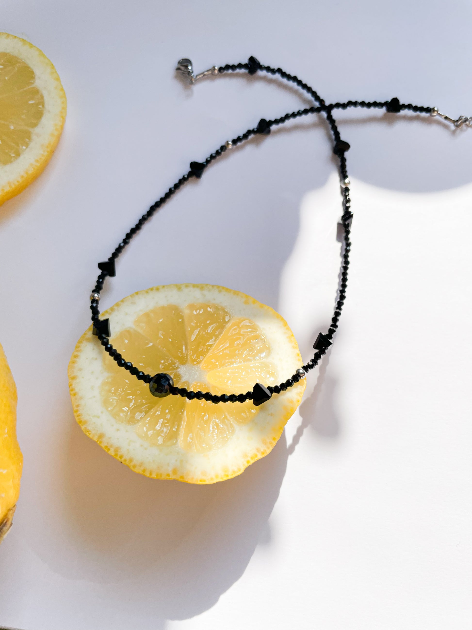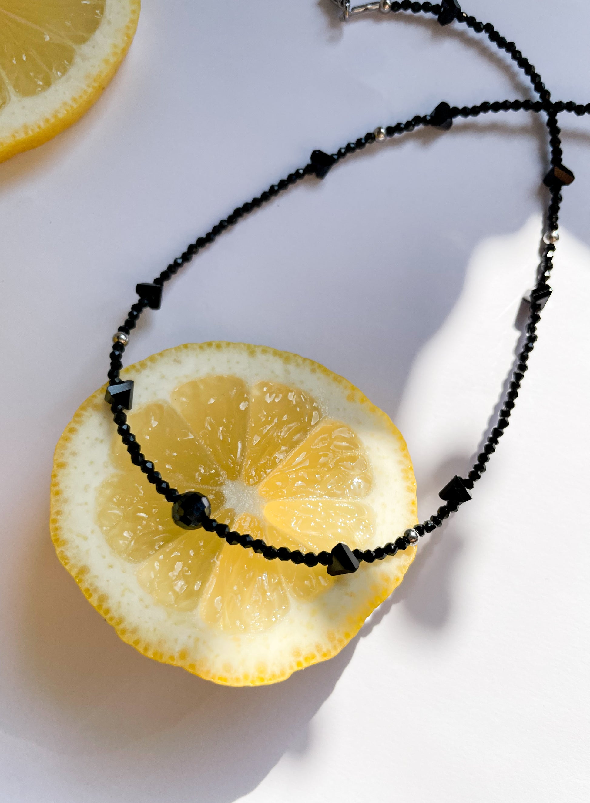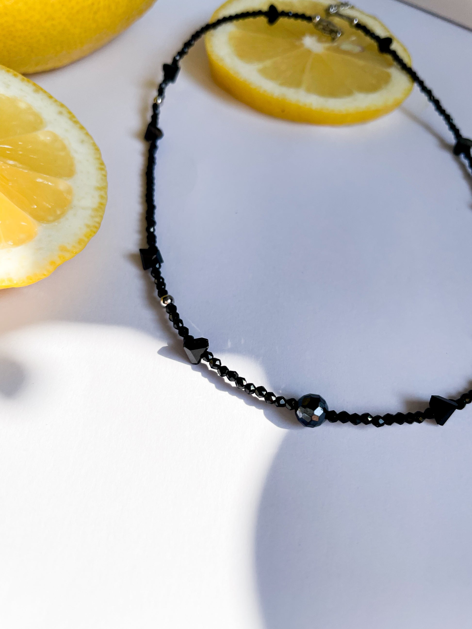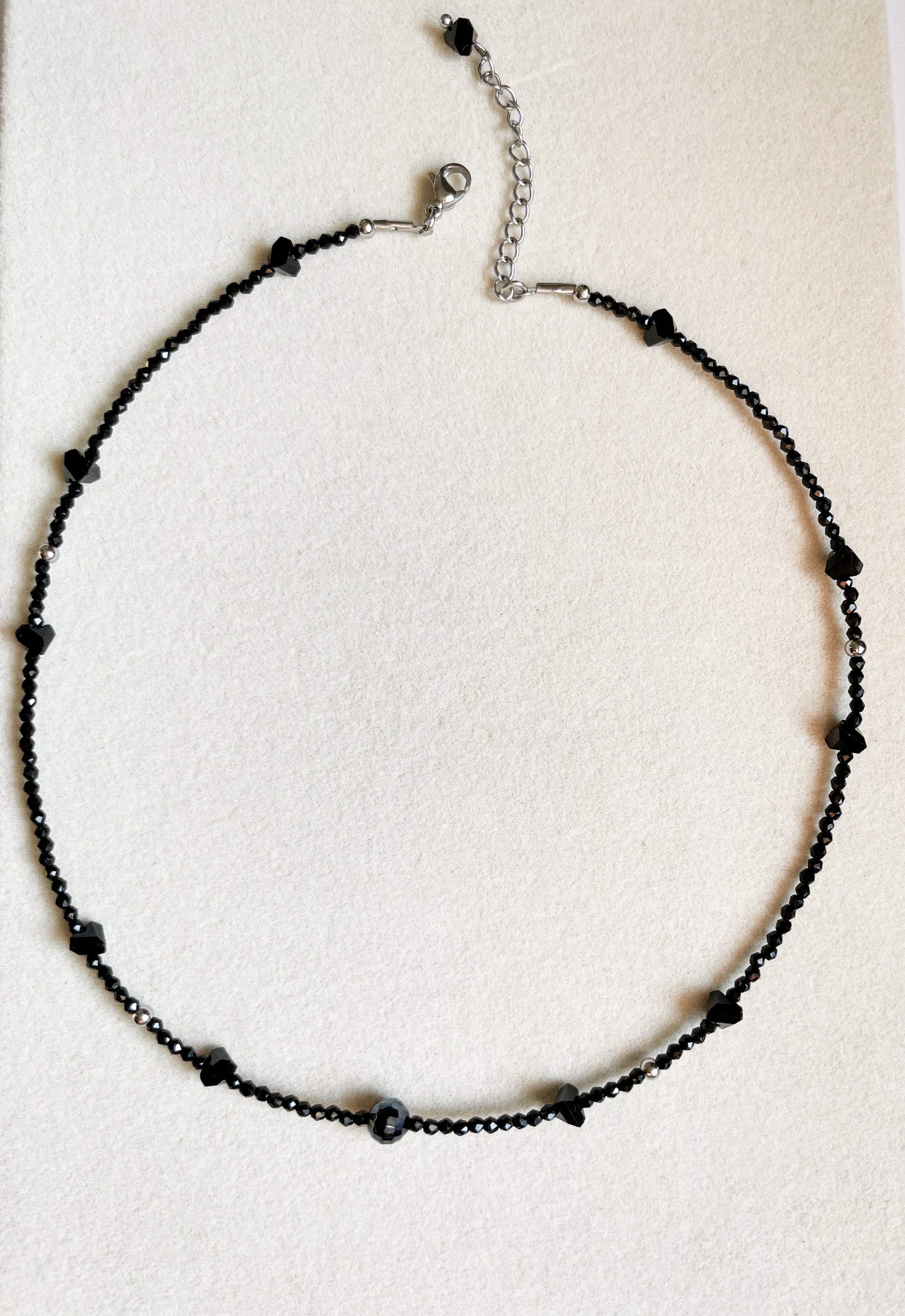 Ръчно изработено късо колие с черни кристали и топчета от медицинска стомана.Изработва се в различни дължини с добавен удължител.