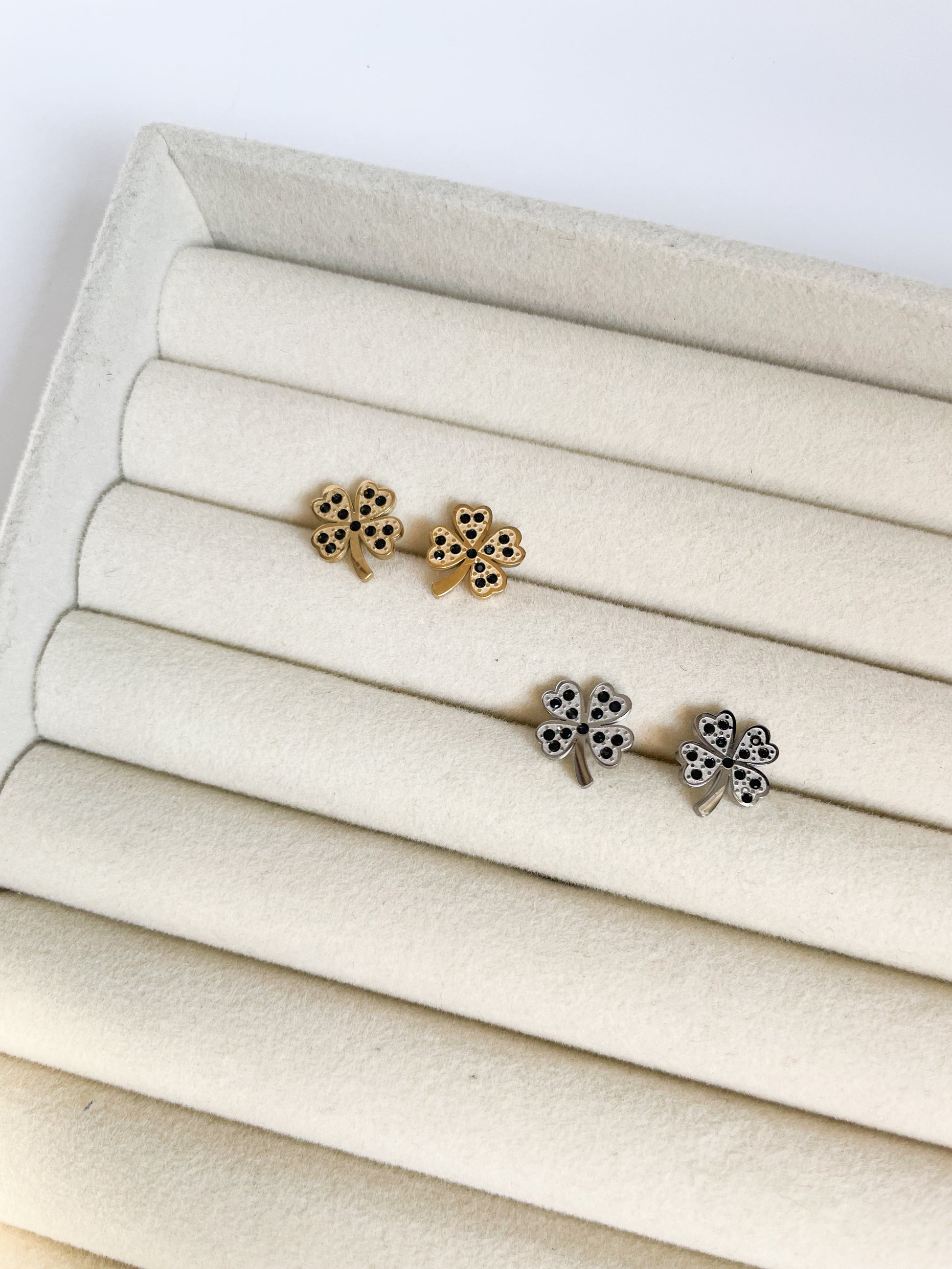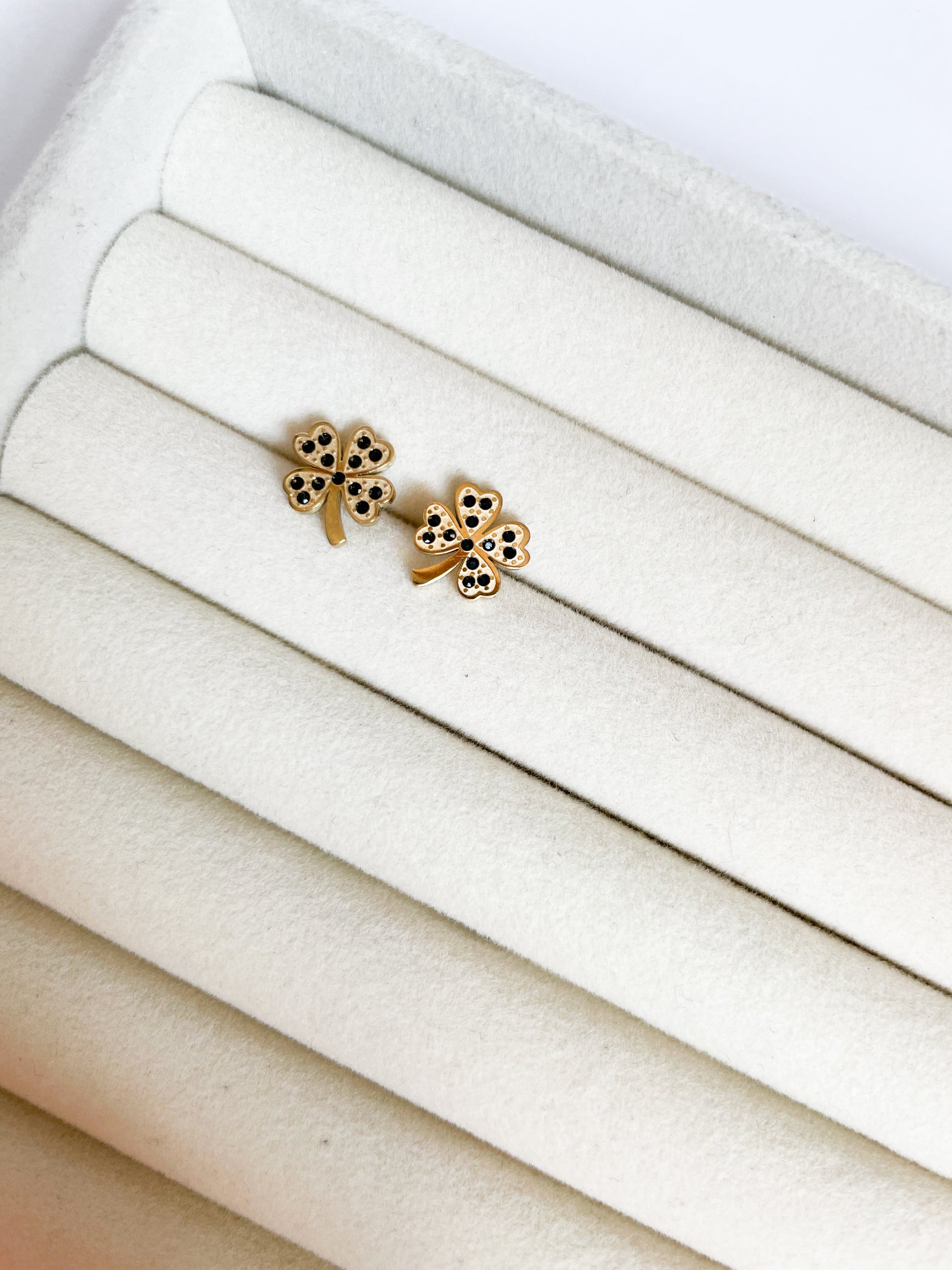 Обеци във формата на детелини с черни камъни на винт от медицинска стомана 316L